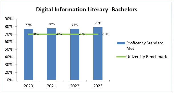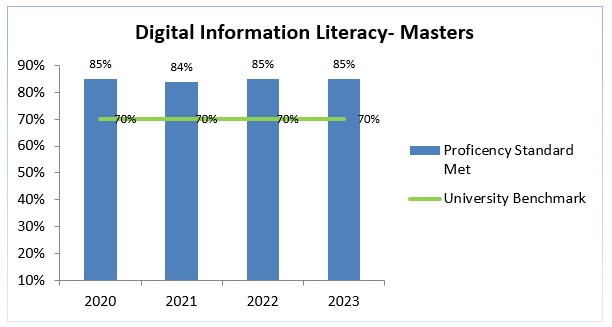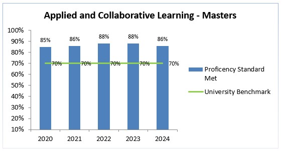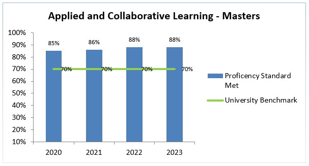 A snapshot of student achievement, in reaching APUS' Institutional Learning Outcomes, is captured using assessment tools within the classroom. Signature assignments, found throughout each academic program, are one measure used to assess students’ success. When aggregated, the results show proficiency in meeting our institutional learning outcomes. American Public University System considers a student’s performance on a signature assignment to show proficiency when an 85% is earned. APUS strives to have 70% or more (university benchmark) of students reaching the 85% proficiency standard. When this benchmark isn't met, action is taken to improve curriculum and instruction.